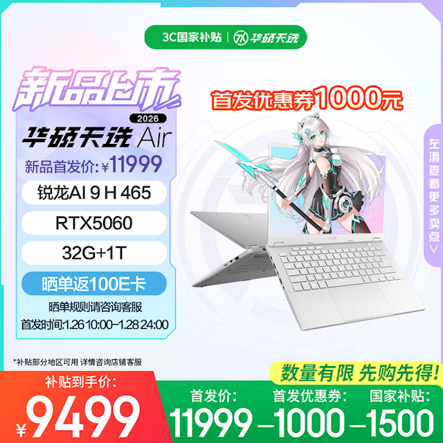 天选Air 2026系列将于1月26日10点整开启首销,截止到1月28日24点期间,在华硕京东自营旗舰店、华硕商城,均可领取1000元首发优惠券,再叠加1500元国补福利,到手价格分别为: