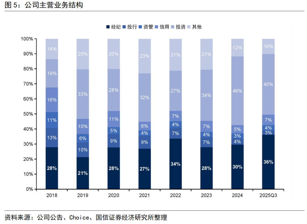 2025年前三季度公司实现营业收入182.44亿元,同比+27.76%;实现归母净利润88.71亿元,同比+24.08%;扣除非经常性损益后的净利润为88.62亿元,同比+24.02%,ROE为7.18%,同比增加1.06pct;EPS为0.97元/股,同比+25.97%。公司业绩上涨主要因市场行情持续上行,交投活跃度增强等因素影响,各大业务收入均呈现明显增长。