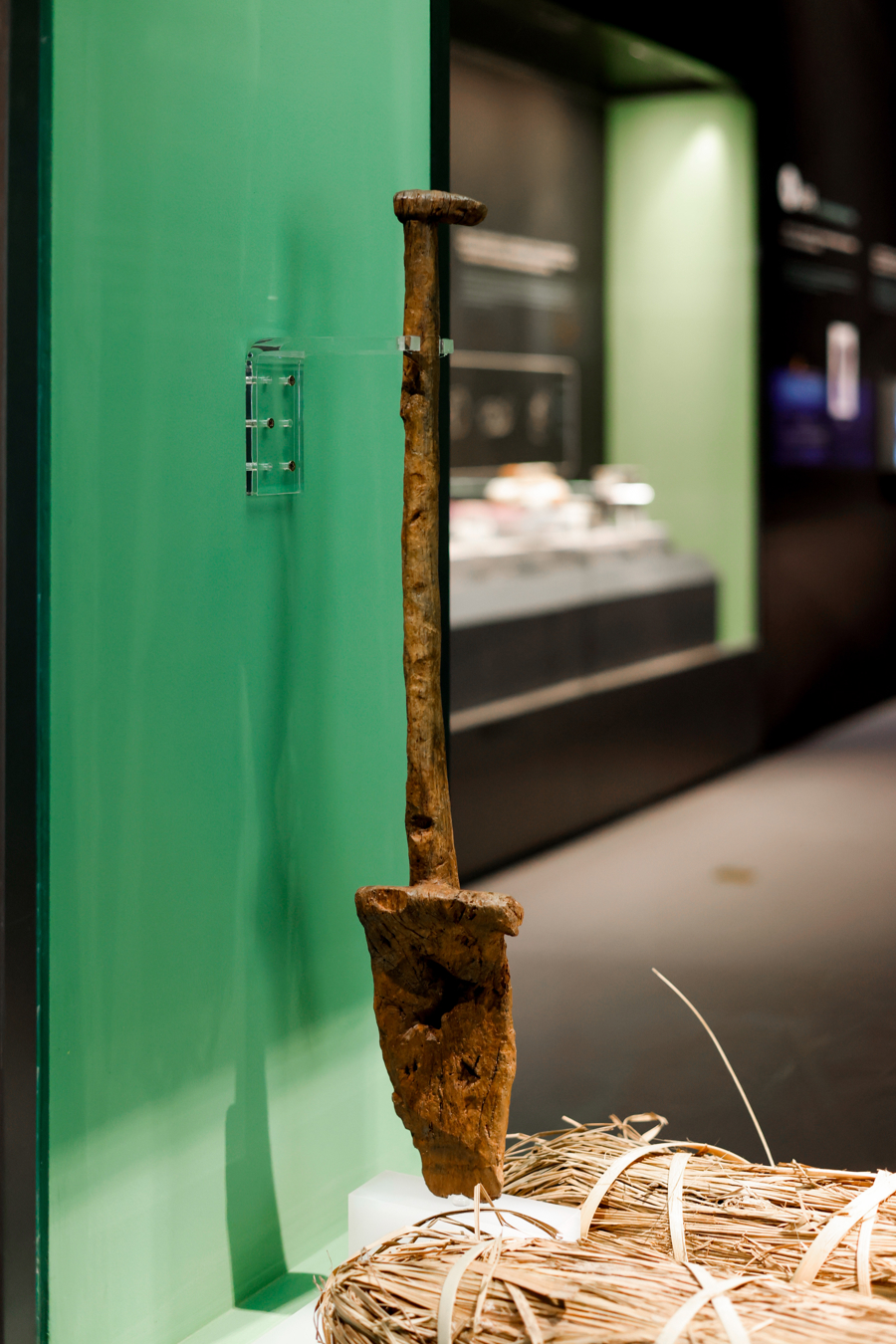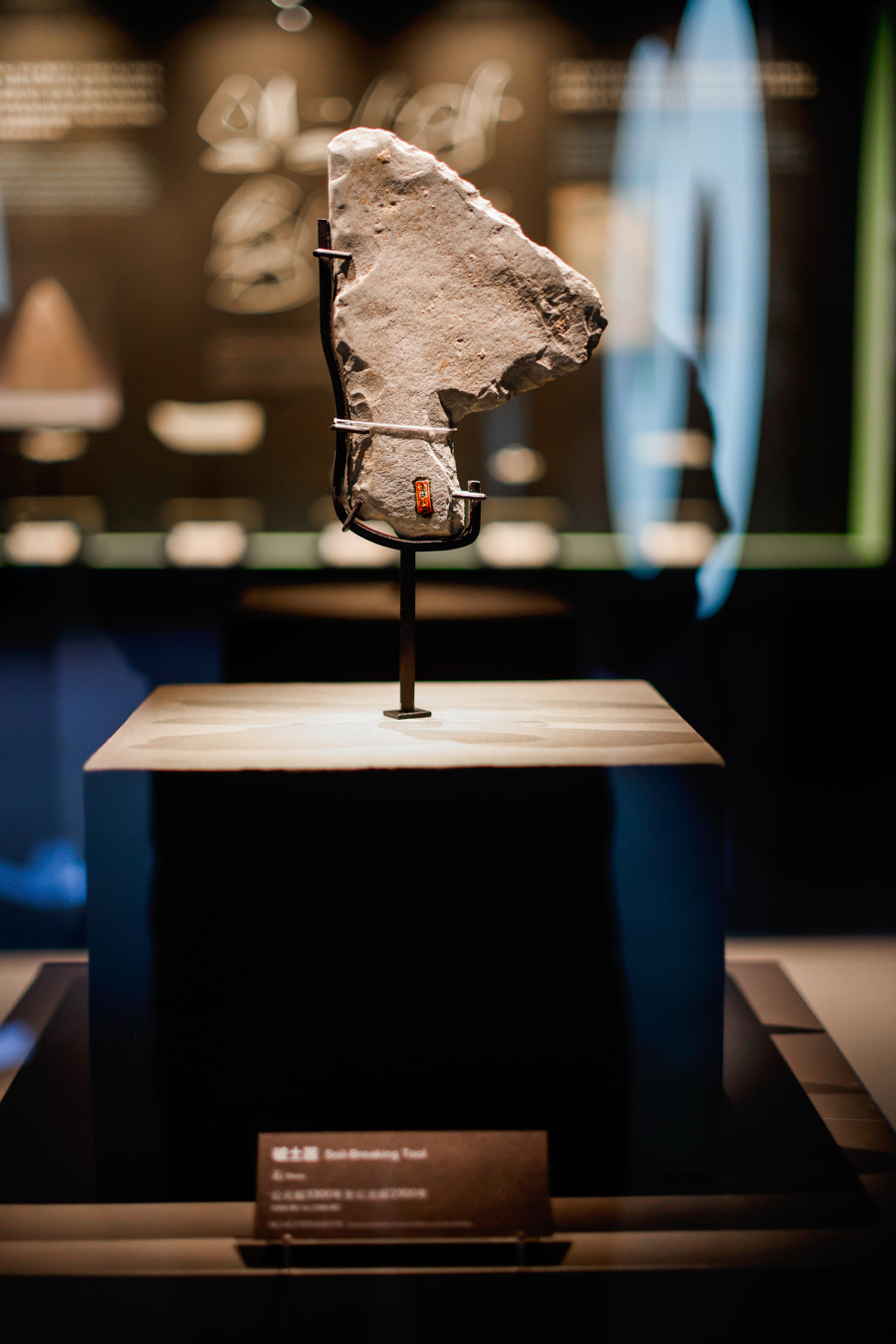 走进展厅,迎接观众视线的首件文物是一件破土器,年代为公元前 3300 年至公元前 2300 年。它看似拙朴,却是良渚稻作农业高度发展的见证。正是石犁、破土器等农具的革新与变革,使得良渚的生产力大幅提升。