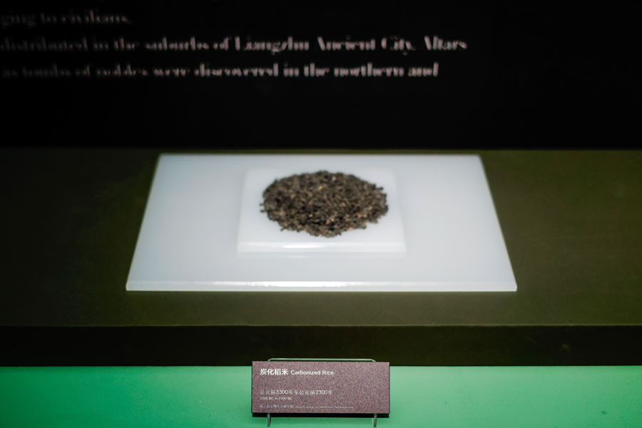 展柜中,距今5000年的炭化稻米,直接印证了当时“鱼米之乡”的农业规模。在良渚遗址莫角山宫殿区,考古学家发现了多处与粮仓相关的炭化稻谷堆积,仅宫殿区东坡出土的炭化稻米就有约2.6万斤。