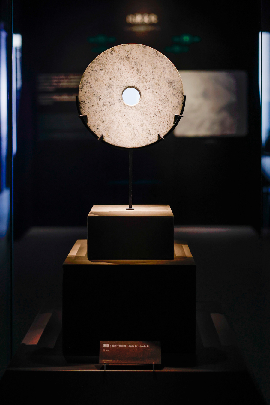 当东方的文明曙光初现,人类如何通过技术创造来构建精神世界?良渚玉器为我们留下了答案。它们不止是装饰品,更是用于构筑整个宇宙观和社会秩序的信仰符号系统。展厅C位,陈列了一件玉璧,是良渚玉器典型代表。它的体型特别大,超过常见良渚玉璧。据湖州市博物馆馆长周颖介绍,这件玉璧自2019出土后,此番是首次面向公众展出。