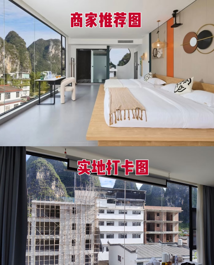 无独有偶,从阳朔旅游归来的王倩(化名)也遇到了“照骗”。预定时,商家提供的图片显示,卧室落地窗正对一片山景。虽然低矮处有一些楼房,但总体不影响阳光明媚、视野开阔的视觉效果。可入住时,王倩发现商家发布的照片不仅颜色和光线用修图软件调整过,就连景色也大不一样:落地窗前“长”出好几栋正在建设的楼房,整个民宿好像在一个大工地里。