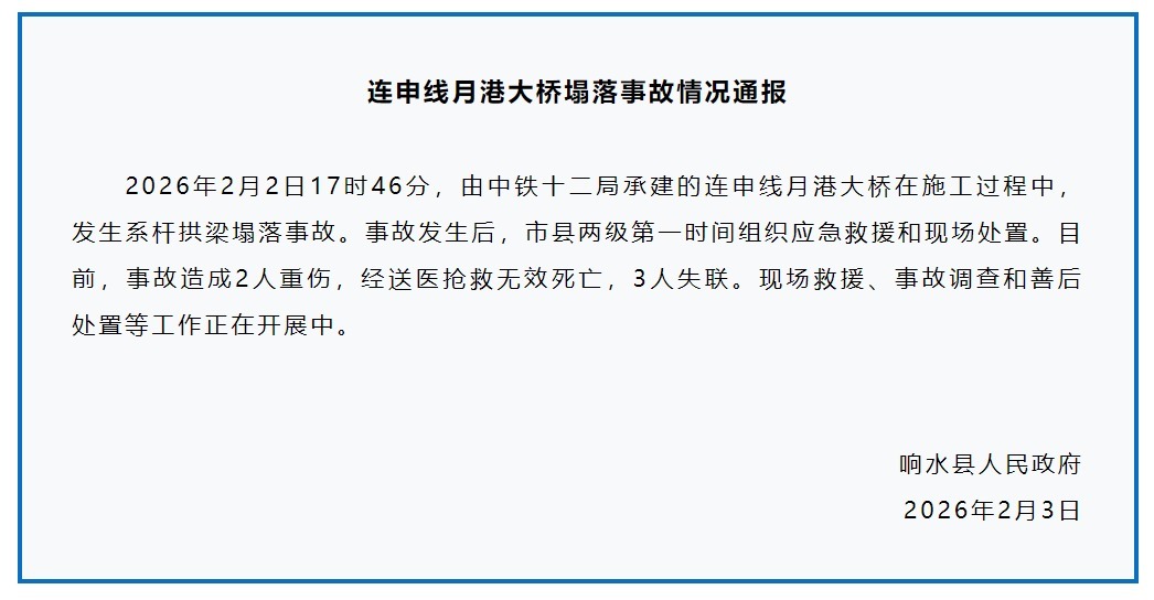 2月2日17时46分,由中铁十二局承建的连申线月港大桥在施工过程中,发生系杆拱梁塌落事故。据响水县人民政府通报,目前,事故造成2人重伤,经送医抢救无效死亡,3人失联。现场救援、事故调查和善后处置等工作正在开展中。